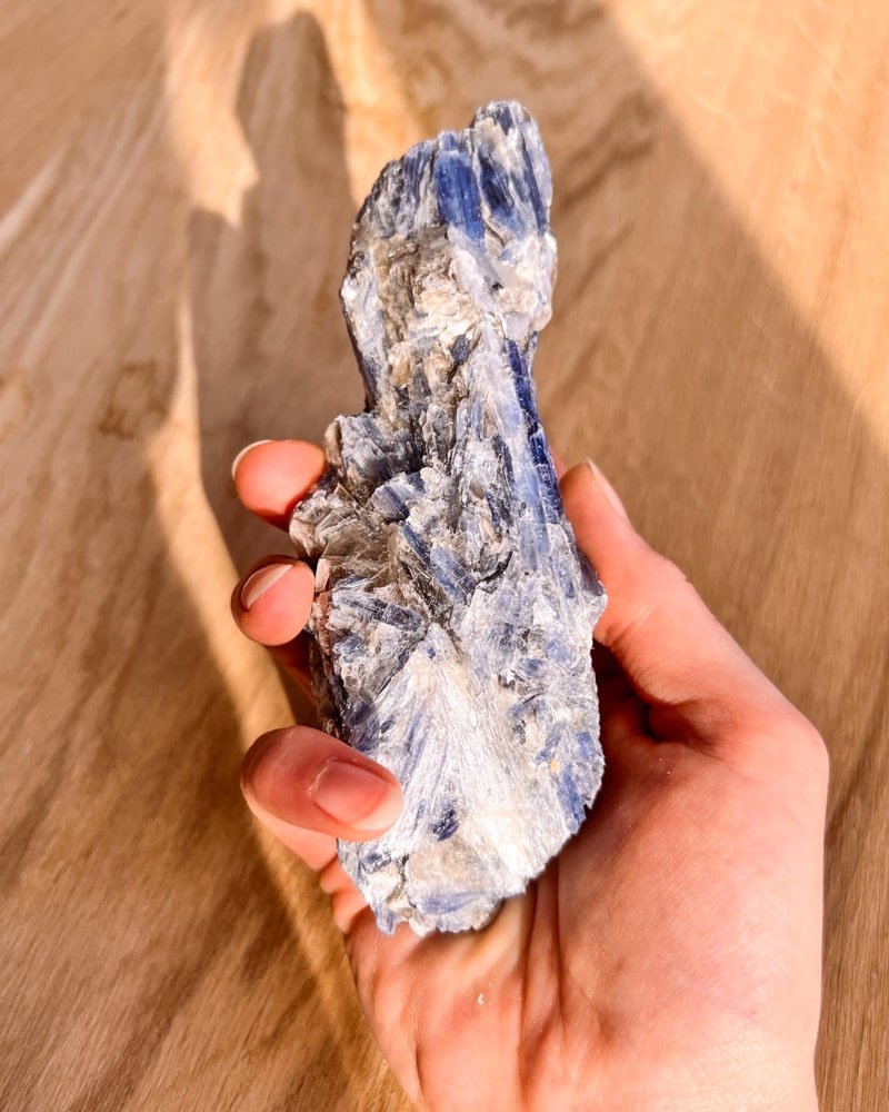 La cyanite va booster notre créativité. Elle nous aide à sortir de notre coquille. Elle nous permet de surmonter tous les blocages et les appréhensions que nous pourrions avoir pour exprimer toutes les facettes de ce que nous sommes. Elle nous assiste à mieux communiquer avec le monde. La cyanite est comme un coach pour nous. Grâce à elle on reprend confiance et on se reconnecte aux ressources nécessaires pour mieux exprimer notre individualité unique.